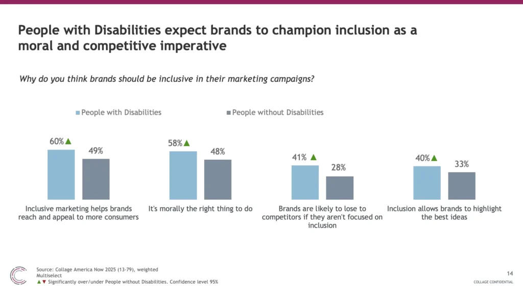 Consumers with disabilities often view the country’s social landscape differently than the general population. Their direct experiences navigating systems, infrastructure, and social attitudes give them a nuanced perspective on fairness and belonging. As a result, they place high value on brands that demonstrate proven inclusion in how they communicate, operate, and innovate.